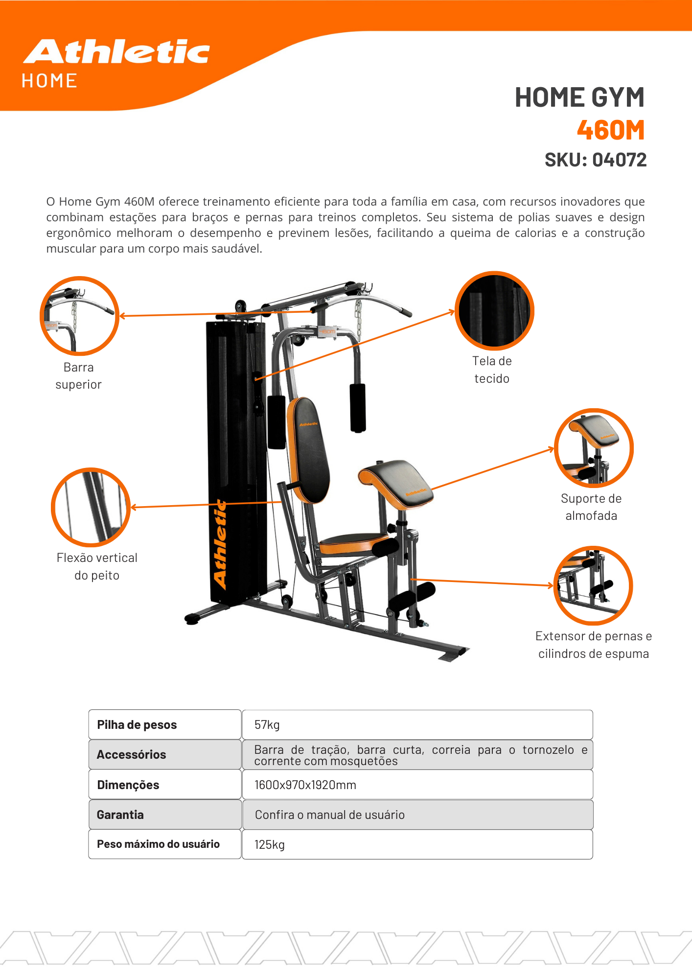 Para maior conforto direto da sua casa, a HOME GYM 460M possui exercícios completos com durabilidade garantida com cabos japoneses, polia com rolamentos, acessórios exclusivos.