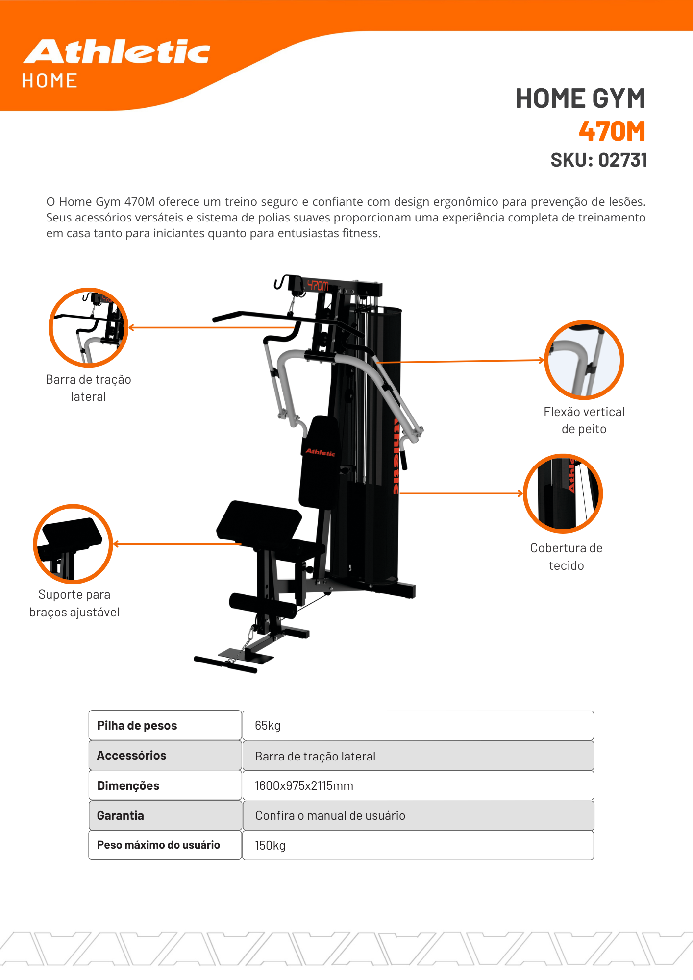 Treine seu corpo inteiro com o Home Gym 470M. Este equipamento versátil possui uma pilha de pesos de 65 KG com proteção adicional para maior durabilidade.